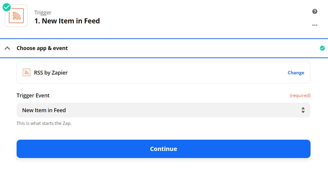 The app that you will be using as the trigger is called "RSS by Zapier." This is one of the many prebuilt apps that is included in Zapier that you get with your membership. When it asks you what you want the Trigger Event to be, you need to select "New Item in Feed."