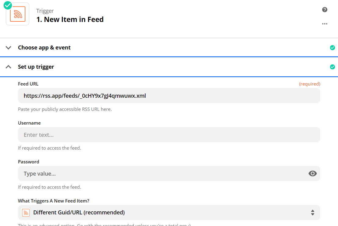 After you paste your RSS URL in to the top field of the set up section, feel free to leave the other sections untouched. For this automation, you can leave them as-is and everything will work fine.